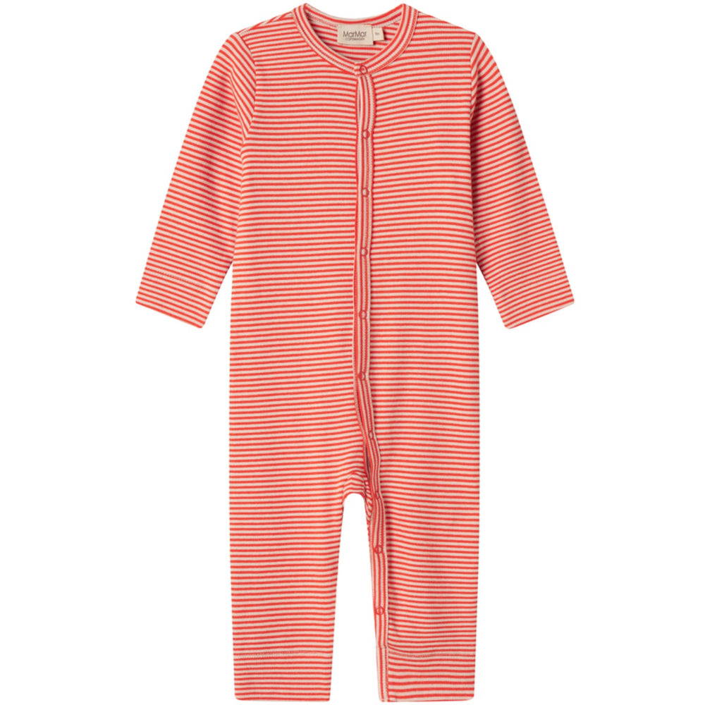 Brighten up your little one's wardrobe with the MarMar Modal Fine Rib Red Stripe Ruka Onesie. Crafted from soft, fine rib modal fabric, this long-sleeved, spacious romper ensures comfort with every wear. It features a striking red stripe design, ideal for vibrant style. Practical snap buttons run down one leg, making diaper changes quick and effortless. Perfect for your child's day-to-day adventures or cozy nap times, this onesie blends charming style with functionality. Easily cared for, keeping this onesie looking fresh and fabulous is a breeze. Ideal for infants who enjoy comfort without compromising on style! Materials: 47% Modal 48% Cotton (Organic) 5% Elastane Washing instructions: Wash - Machine wash 40°C , Bleach - Do not bleach , Drying - Do not tumble dry, Ironing - medium, Dry Clean - Dry clean possible Certifications: OEKO-TEX, LENZING Modal, Organic cotton, SMETA Fine rib knit with elastane Soft, stretchy and comfortable to wear Breathable quality Keeps shape and color Oeko-tex® - Tested for harmful chemicals