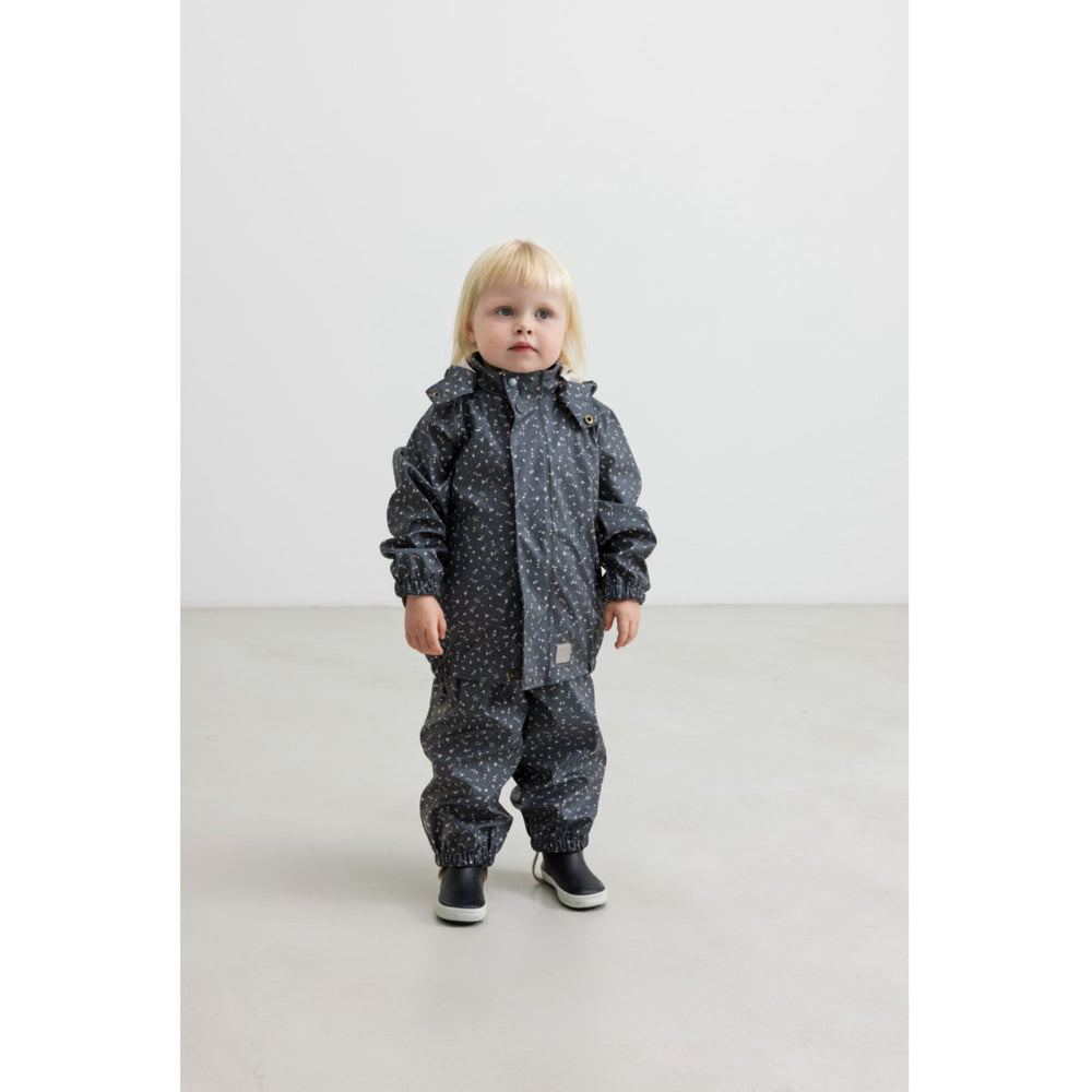 Introduce your child to the delightful MarMar Rainwear Dried Petals Oddy Set, expertly crafted to keep them dry and stylish during rainy days. Featuring a charming design with a muted floral pattern, this set includes a jacket equipped with a handy front pocket, secure zipper, and snap buttons, along with matching rain pants accented with adjustable suspenders and elastic waistband. Crafted from durable materials, this outfit promises comfort, and easy care, making it a perfect choice for playful puddle-jumping adventures. Dive into a world of endless outdoor fun, rain or shine, with this beautifully designed rainwear set! Materials: 100% Polyester (Recycled) PU coating Washing instructions: Wash - Machine wash 30°C gentle, Bleach - Do not bleach , Drying - Do not tumble dry, Ironing - Do not Iron, Dry Clean - Do not dry clean Certifications: OEKOTEX standard 100, GRS, BSCI Rainwear Wind and waterproof (water column pressure of 8000mm) Welded seams Rib inside the collars, which feel soft on the neck Soft fleece details at wrists and in pockets Detachable hood Matching details YKK certified zippers Adjustable shoulder straps on pants Adjustable boot straps under the feet Name label on the inside Oeko-tex® - Tested for harmful chemicals