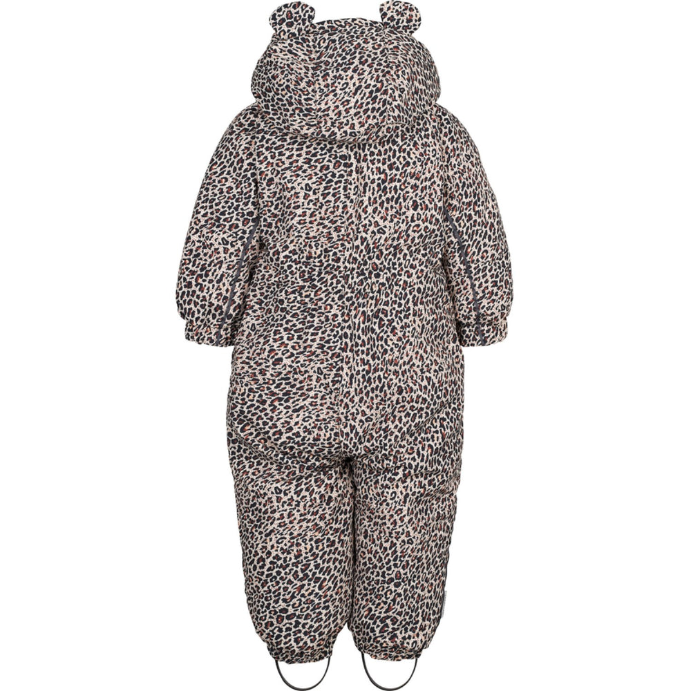 Introducing the MarMar Tech Ollie Suit, the ultimate leopard print winter snowsuit for kids. Crafted for optimal comfort, this lightweight suit boasts a soft texture that's gentle on delicate skin. It includes secure side pockets with zippers, a dual closure system of a zipper and push buttons at the front, and a detachable hood. Adjustable silicone straps under the boots enhance the fit and keep the snow out. Perfect for keeping your little ones cozy and stylish all winter long! Materials: 100% Polyester (Recycled) Washing instructions: Wash - Machine wash 30°C gentle, Bleach - Do not bleach , Drying - Do not tumble dry, Ironing - Do not Iron, Dry Clean - Do not dry clean Certifications: OKEO-TEX Standard 100 Class 2, Recycled Polyester, Bionic-Finish ECO, Thermolite, OEKO-TEX Standard 100 Soft and warm winther outerwear Waterproof (water column pressure of 10,000mm) Breathable with 10,000gr / m2 / 24h Windproof Waterproof taped seams Durable material Thermolite insulation is super light and fluffy, that ensures warm and temperate body temperature Reflective details in matching colors so the child is visible in traffic Ribbed edges in neckline and sleeves which make it nice and comfortable to wear The pockets have soft fleece lining Removeble hood with ears. Elastic at the back of the waist for a better fit Detachable and adjustable rubber straps under the feet Elastic suspenders on the inside Matching details YKK certified zippers Namelabel on the inside