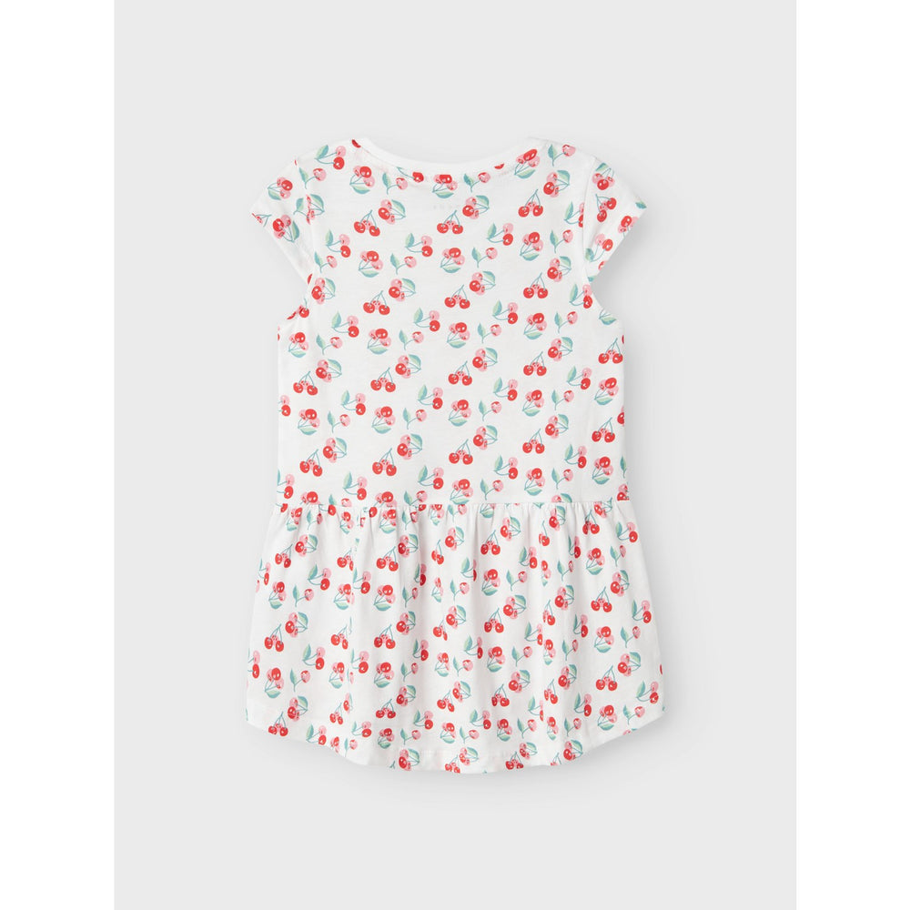 Discover the Name It Bright White Cherries Vigga Dress Noos, a stunning addition to any child's wardrobe. This regular-fit dress features a playful cherry print across its entirety, crafted from 100% cotton jersey for ultimate comfort and movement. With short sleeves and a round neck, it offers both style and ease of wear. Perfect for various occasions, this dress blends delightful aesthetics with practicality daily. The fabric ensures breezy care, staying fresh even after frequent washing. Ideal for kids who love to look good while playing hard!