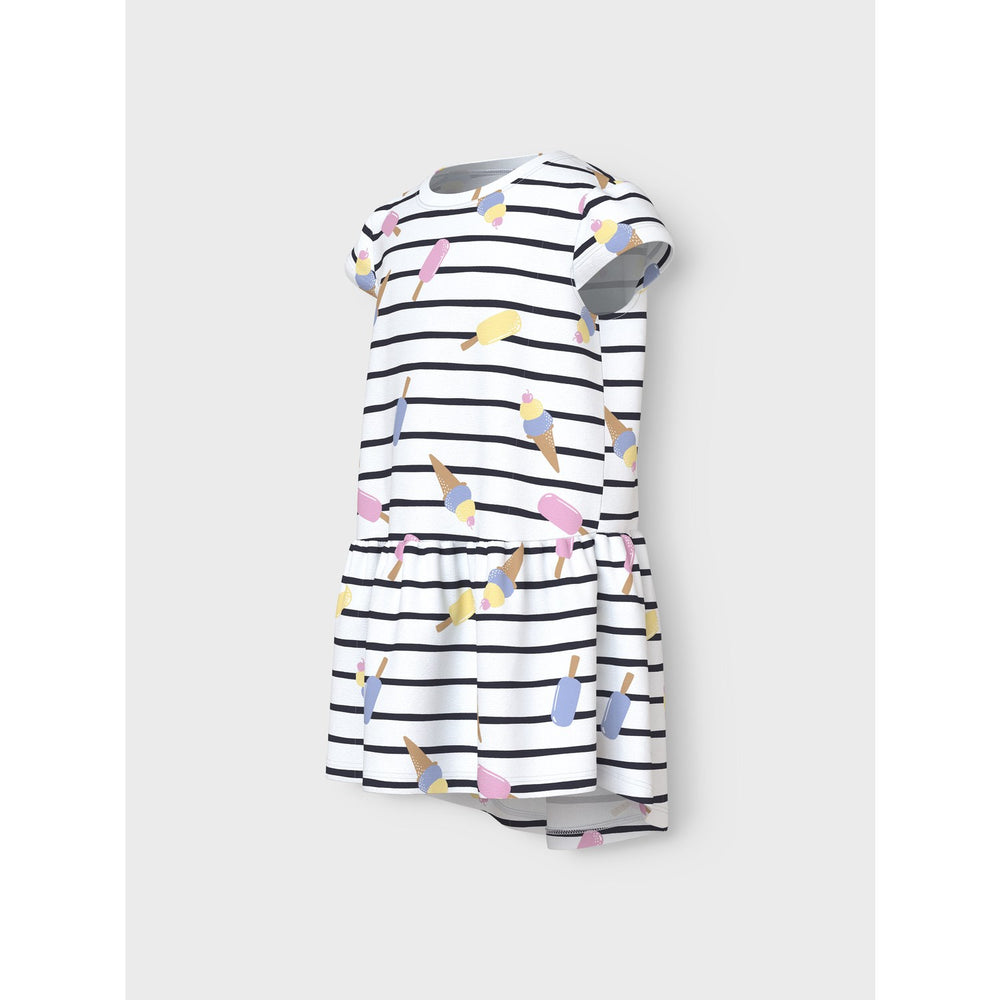 Dress your little one in the whimsical charm of the Name It Bright White Ice Vigga Capsl Dress F1 Noos, blending style and comfort effortlessly. Crafted from soft, stretchy jersey fabric, this dress promises a gentle touch and ample flexibility for all-day play. Featuring a delightful all-over print, short sleeves, and a classic round neck, it's fashioned for a regular fit that suits any lively occasion. This easy-care dress ensures lasting wear and vibrant appeal, making it a delightful addition to any young wardrobe. Ideal for both festive gatherings and casual outings, its versatility makes it a staple for every child's clothing collection.