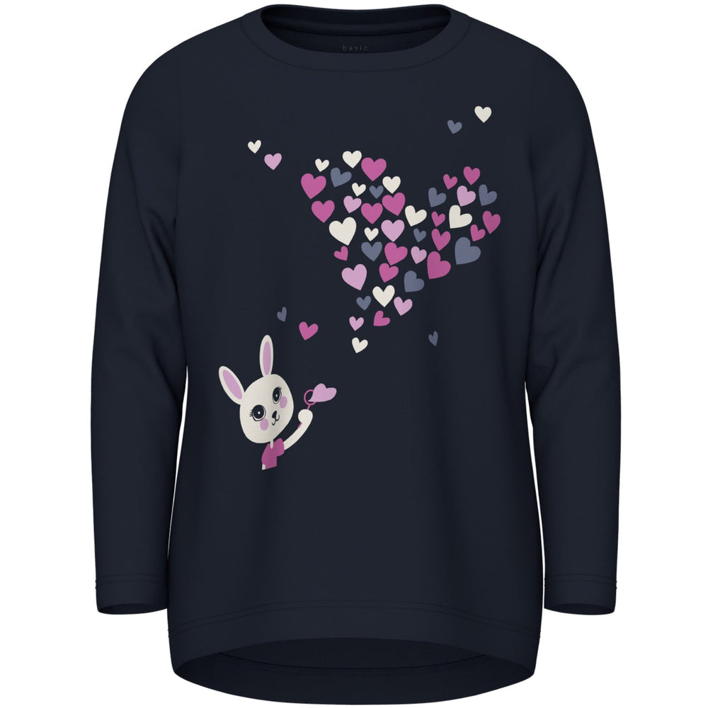 This top features a classic round neck and long sleeves, perfect for transitioning from playtime to special occasions effortlessly. Its standard fit allows for easy movement, making it an ideal choice for your active little one. Its dark sapphire color, enriched with an eye-catching bunny design, makes it both versatile and stylish.