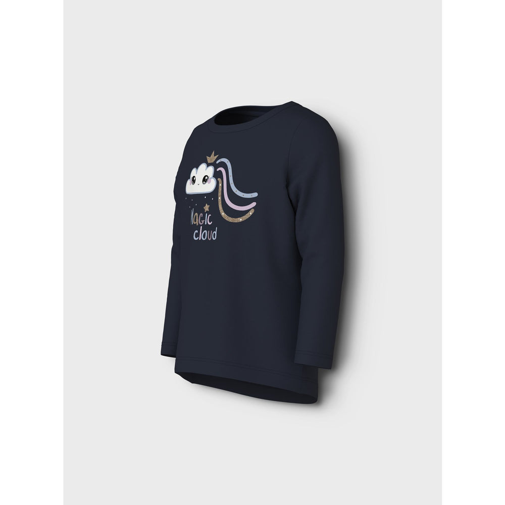 Discover the enchanting Name It Dark Sapphire Magic Cloud Vix Blouse, a stellar addition to any child's clothing collection. Crafted from lightweight and stretchy jersey, this blouse ensures comfort with its soft interior and exterior. Ideal for both everyday wear and special events, it features a round neck and long sleeves, adorned with a unique glitter and rubber print for a touch of sparkle and softness. This top comes in a standard fit, making it perfect for kids on the move. Easy to care for and wonderfully versatile, this blouse offers style and comfort in one magical package.