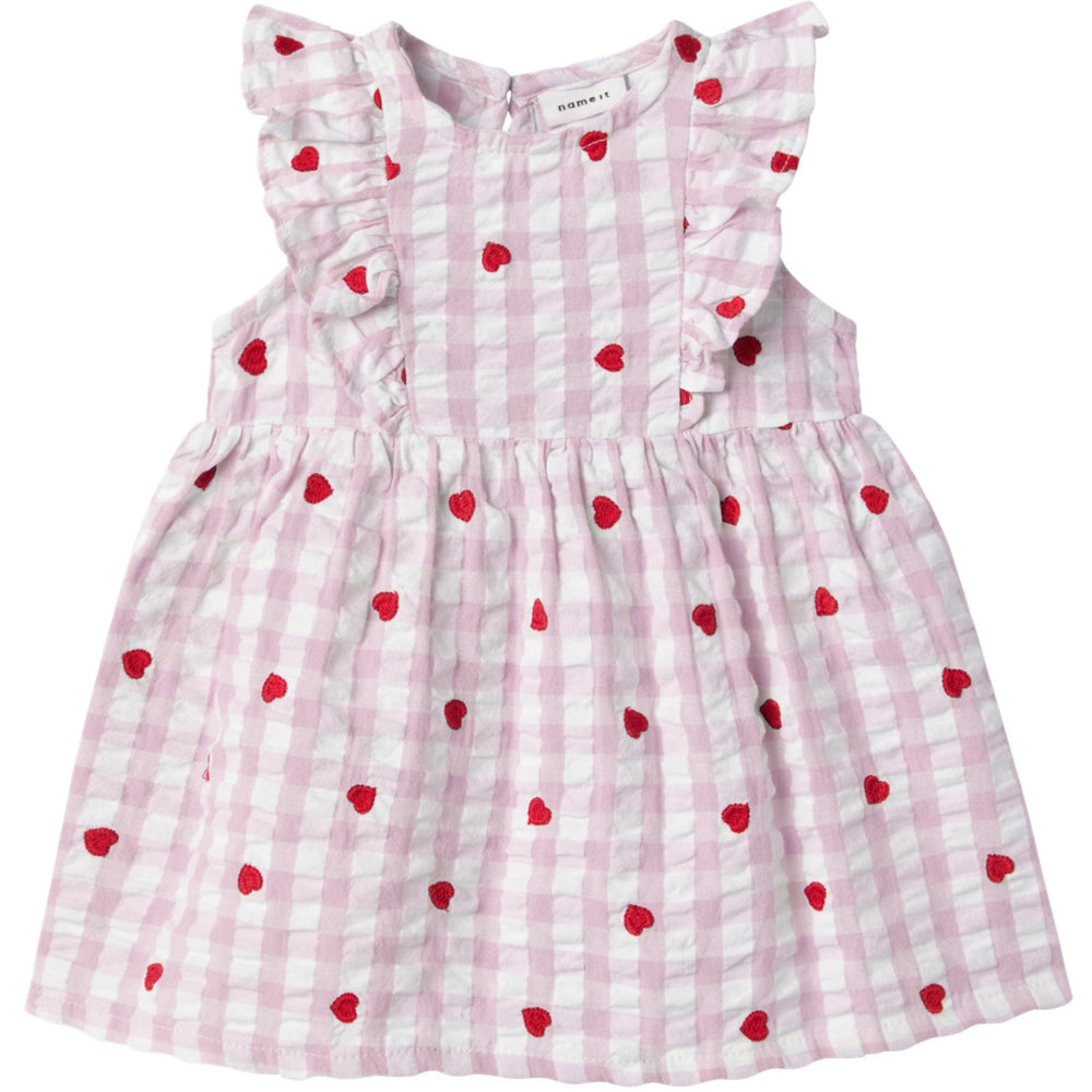 Introducing the Name It Light Lilac Fisina Spencer Dress, a delightful addition to your child's wardrobe collection. Featuring a sophisticated woven fabric with a criss-cross pattern and lightly textured surface, this dress ensures a classic and stylish look. The charming light lilac hue is adorned with a lovely print spread uniformly across, alongside delicate embroidery and playful frills that add a touch of whimsy. Designed for comfort and ease, it boasts a sleeveless cut with a round neck and a secure button-and-loop fastening, ensuring a regular fit that's perfect for any playful or formal occasion. The garment is easy to care for, enhancing its durability and wearability. Always remember to keep this adorable piece away from fire for safety. Ideal for both everyday and special events, this spencer dress combines functionality with fashion to keep your little one looking and feeling great.