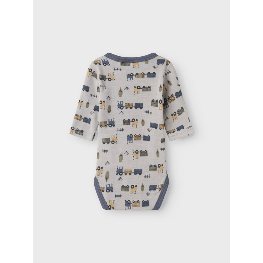 Designed with a cheery tractor pattern that adds a dash of playfulness, this bodysuit comes in a soothing 'Micro Chip' shade that complements its style. It features a convenient round neck and long sleeves that offer full coverage. The practical press stud fastening in the crotch simplifies dressing and diaper changes, enhancing its functionality.