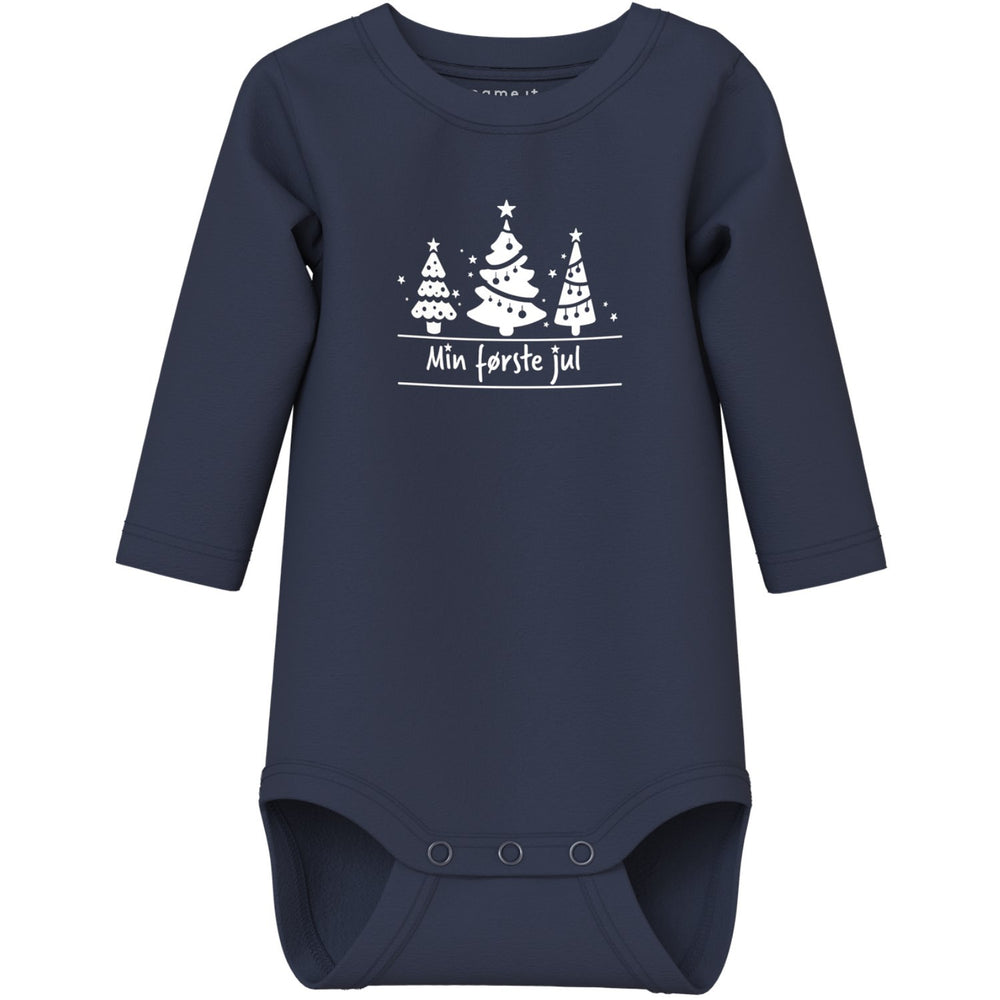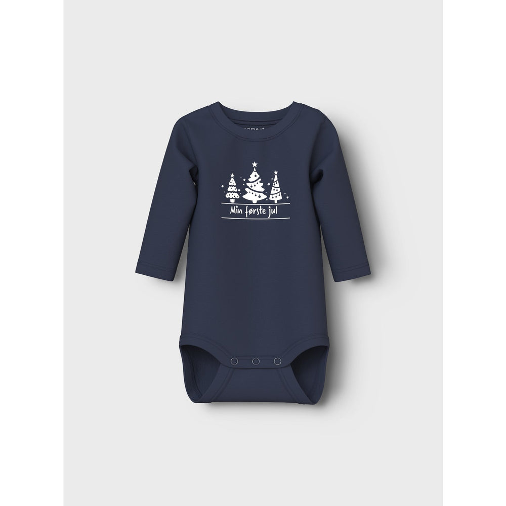 Dress your little one in the joy of the season with the Name It Navy Blazer Jul Nbnrajul Ls Body. Designed for both comfort and style, this bodysuit features a soft, stretchy jersey material ensuring easy movement and a gentle touch on the skin. Its long sleeves and round neck offer a classic look, while the press stud fastening makes dressing hassle-free. The cheerful, festive design makes it perfect for holiday celebrations, promising to keep your child cozy and cute. Ideal for infants, always remember to keep it away from fire for your child’s safety.