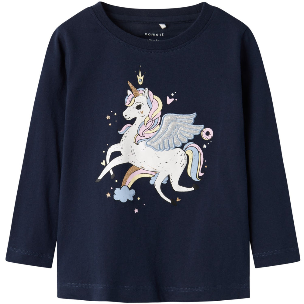 Dress your little one in style with the Name It Navy Blazer Tillie Blouse, an ideal choice for both daily wear and special events. Crafted from jersey, this top is light yet durable, providing comfort with its soft interior and stretchy material that supports all the playful activities your child might engage in. Featuring a classic round neck and long sleeves adorned with eye-catching 3D embroidery, this blouse is enhanced by a sparkling glitter print that stands out. The regular fit ensures a snug yet cozy experience, making it a wardrobe essential that is easy to maintain and perfect for any occasion.