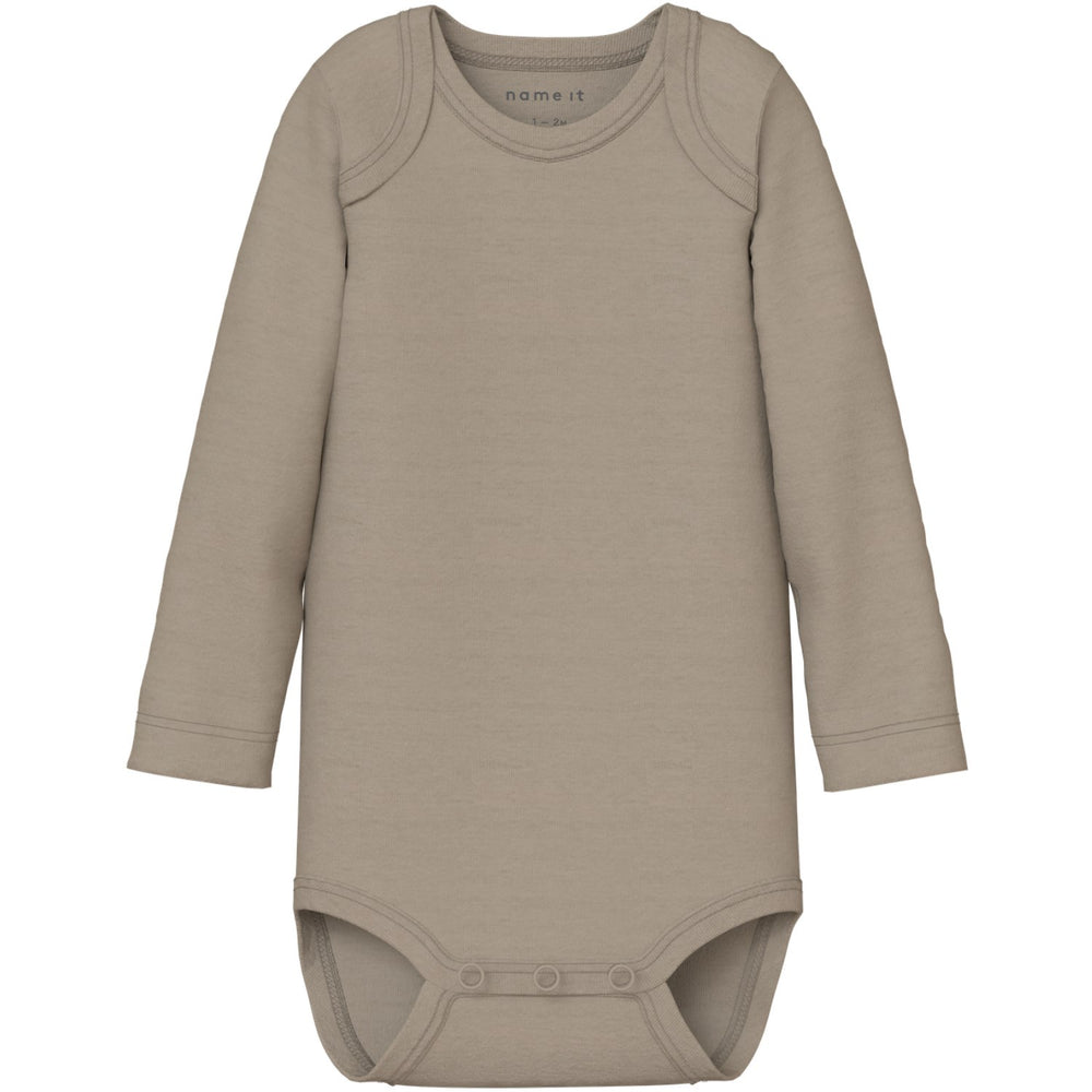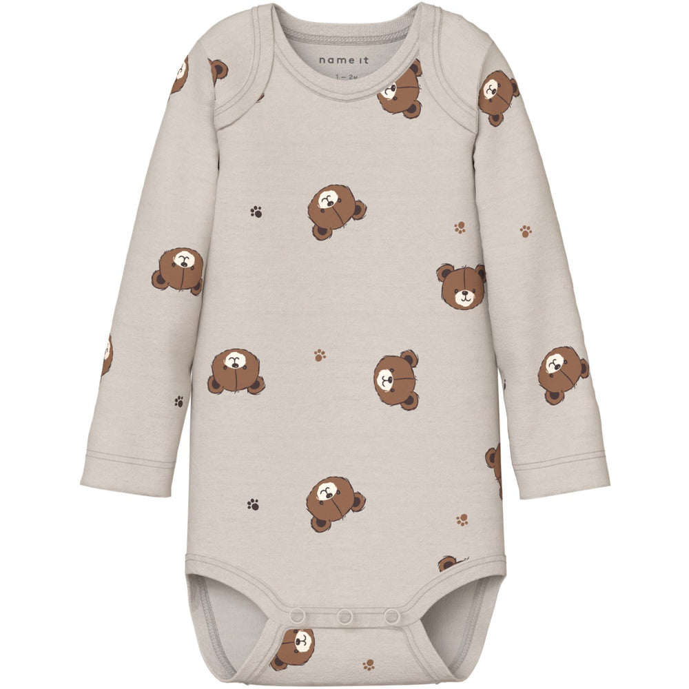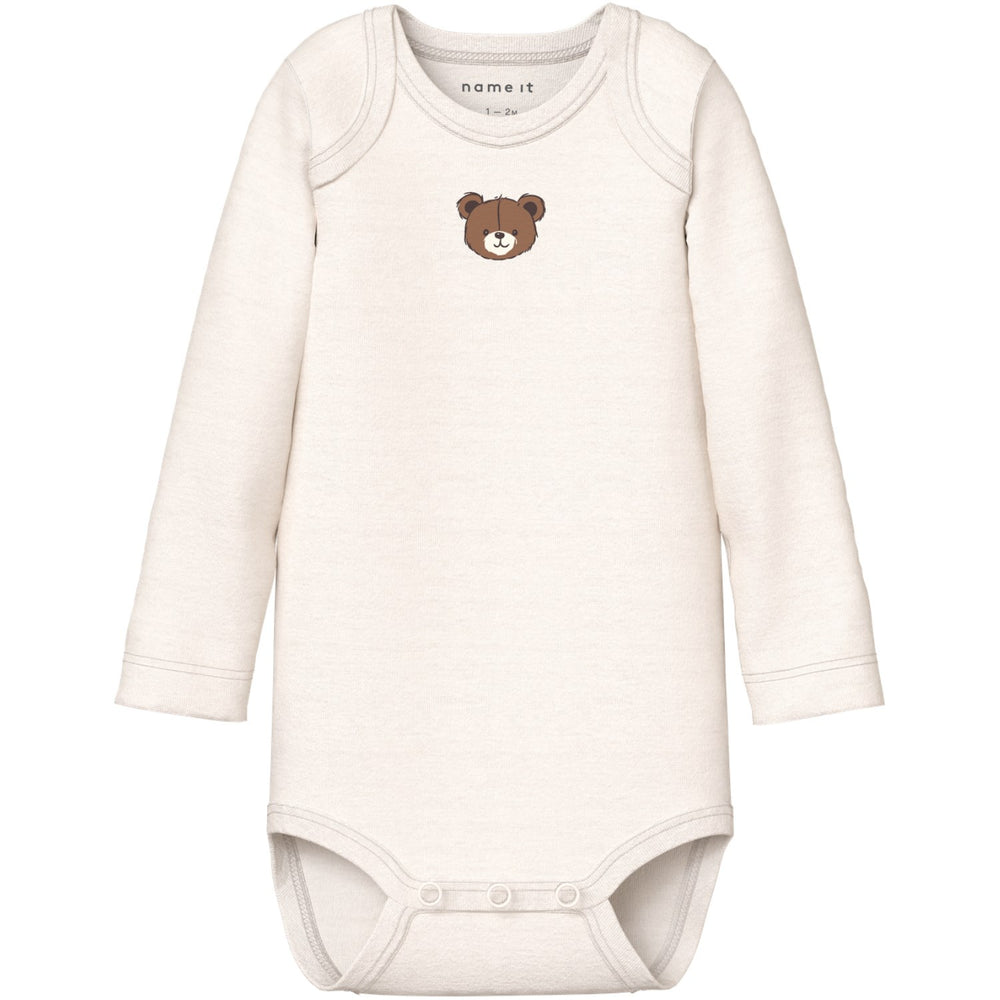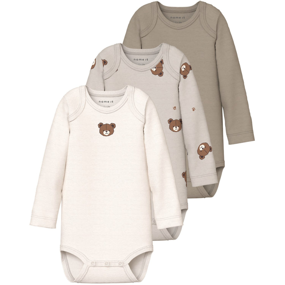 Introduce your little one to cozy comfort with the Name It Pumice Stone Nbnbody 3P Ls Pumice Bear Noos bodysuits. Crafted in a soft rib knit with a classic vertical stripe design and excellent elasticity, these suits ensure a snug yet comfortable fit. Featuring a convenient American neckline and long sleeves, each bodysuit in this 3-pack is easy to slip on with press stud fastenings for quick changes. Available in soothing pumice stone hues, they are ideal for year-round wear. Note: Keep these garments away from fire. Perfect for everyday comfort and practicality, these bodysuits are a must-have in your child's wardrobe.