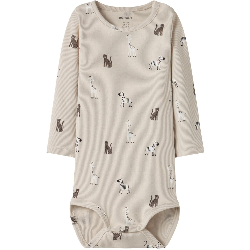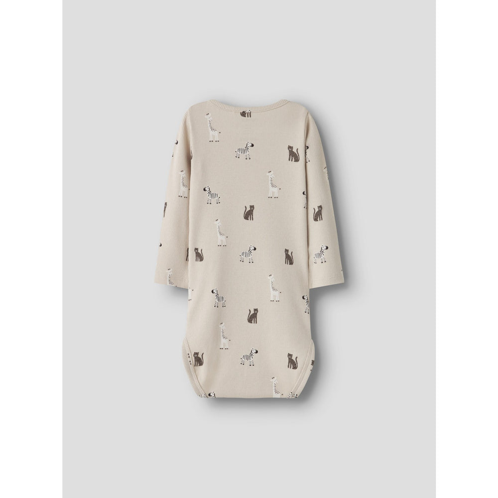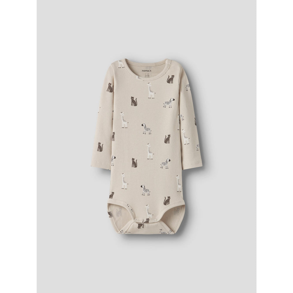 Introduce the Name It Summer Sand Nbntolla Ls Body to your child's wardrobe for vibrant appeal and ultimate comfort. Made with rib knit for enhanced elasticity, this bodysuit features a vertical striped pattern ensuring a classic style. Highlights include easy-to-use press stud fastenings at the crotch and shoulder, as well as a charming repeated print throughout. It comes with long sleeves and a round neck for added coziness. Ideal for year-round use, this bodysuit combines practicality with playful design and safety, keeping them close to comfort while warning to keep away from fire. Perfect for everyday adventures and relaxation alike!