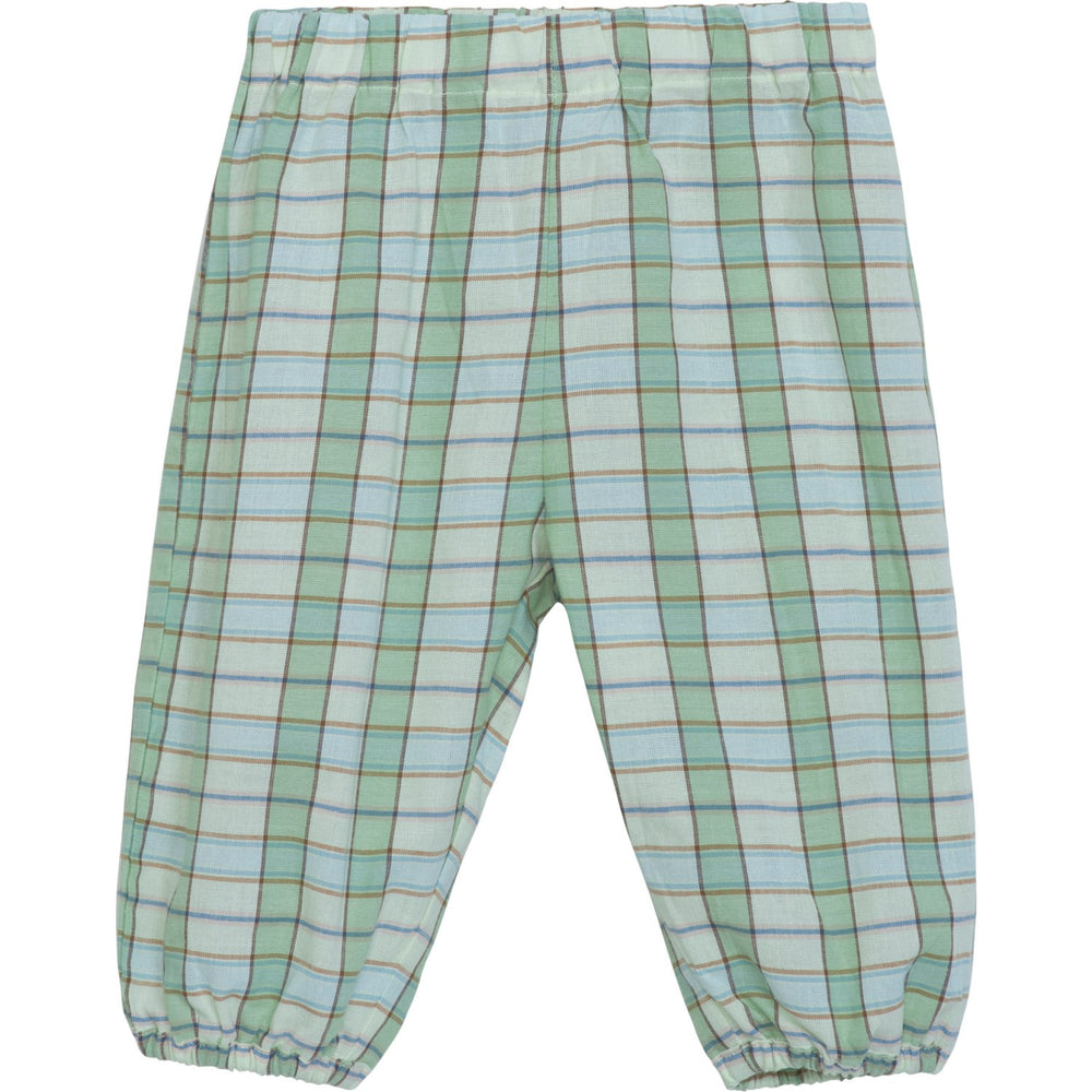 Discover the charming Serendipity Aloe Checks Baby Pants, perfect for hot days. These lightweight pants are made of 100% organic cotton with GOTS certification, protecting both the environment and your child's skin. The crisp checkered pattern in Aloe green with shades of blue and brown adds style, while the loose fit and elastic at the waist and ankles guarantee comfort. An ideal choice for play and relaxation.