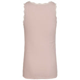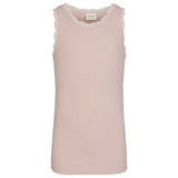 Super smart top for the older girls. This one in a nice light pink color with fine lace edges. The top has a round neck and no sleeves. Absolutely perfect under a knit or blazer.