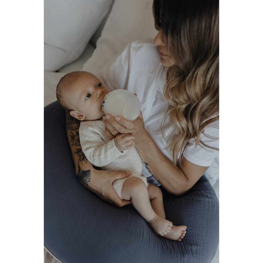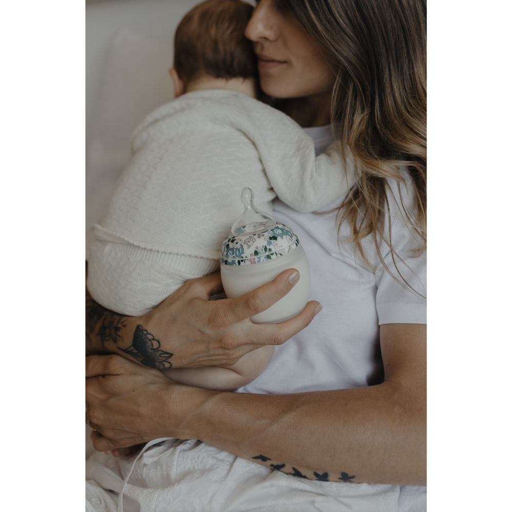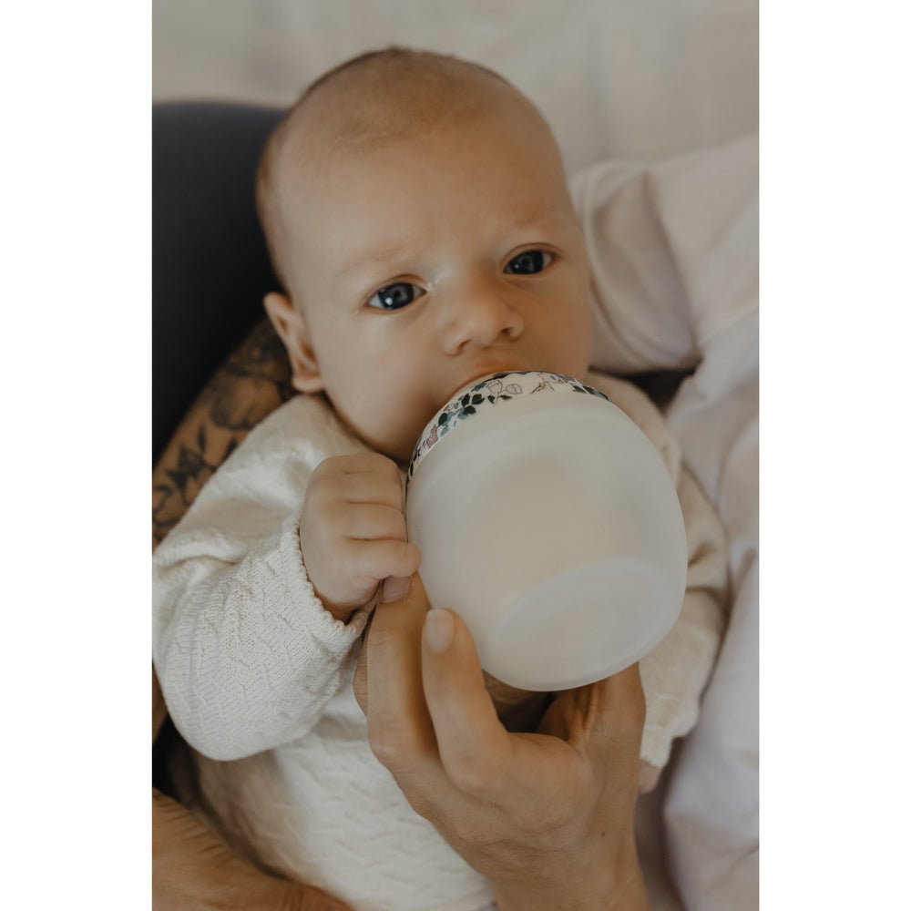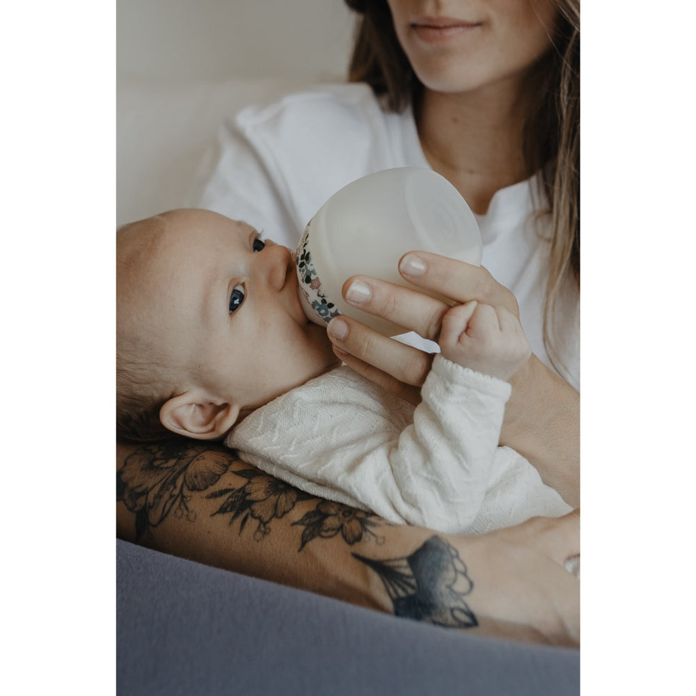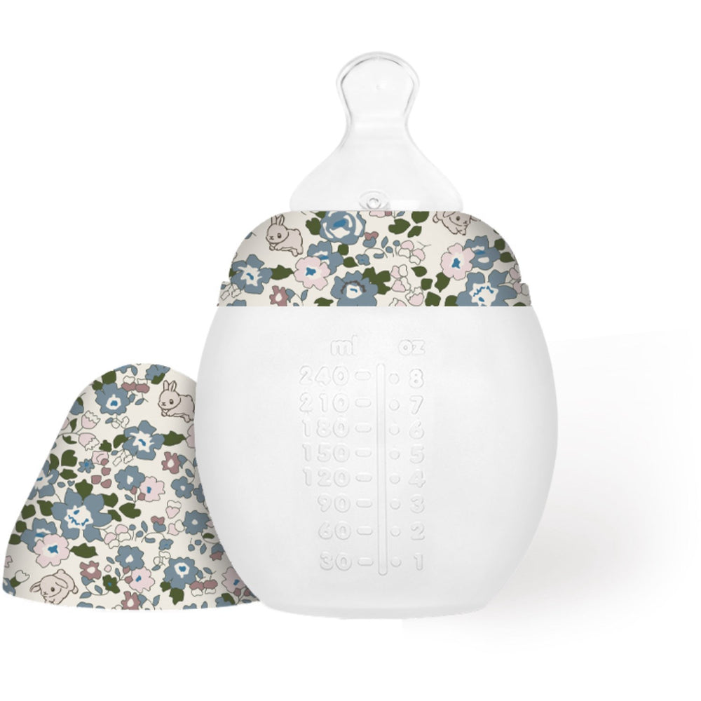 Discover the charm of the That's Mine X Élhée Flores and Bunnies Collab Baby Bottle! Designed with both aesthetics and safety in mind, this 240 ml bottle holds certifications that meet the highest standards. The ergonomic design ensures easy handling for both parents and babies, while the skin-soft nipple mimics natural feeding. It's versatile for various liquids, easy to clean, and compact for efficient storage, enhancing both feeding time and baby's stimulation through its playful design. Ideal for modern, busy families who value style, safety, and function. Materials: 100% Medical grade silicone Washing instructions: Hand washing recommended for longer product life. Use an organic, fragrance-free washing-up liquid. Leave to dry on a drainer or clean cloth. Volume: 240 ml