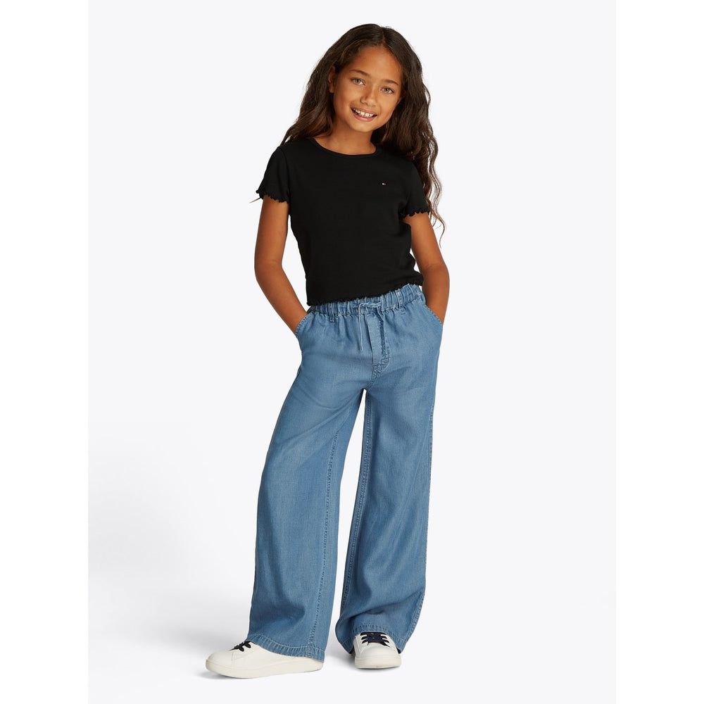 Discover the Tommy Hilfiger Black Essential Rib Top SS, ideal for fashion-forward kids. Crafted from soft, durable fabric, this T-shirt boasts a classic black hue with a subtle ribbed pattern, offering both style and comfort. Perfect for daily wear, it's easy to care for and complements any outfit with its timeless design and snug fit. Ideal for playdates to casual outings, it's a wardrobe must-have for any young fashion enthusiast.